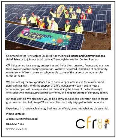 Communities for Renewables CIC (CfR) is recruiting a Financing and Communications Administrator to join their team at Tremough Innovation Centre, Penryn. CfR is a not for profit company which helps set up and manage community energy enterprises in villages, towns and cities around the UK.